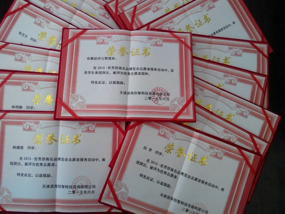 ,代表2015天津世界侨商名品博览会向在侨博会期间承担志愿者服务活动的我院15名同学颁发荣誉证书以及授予会展经济与管理系“优秀志愿者团体”称号。樱花漫画
